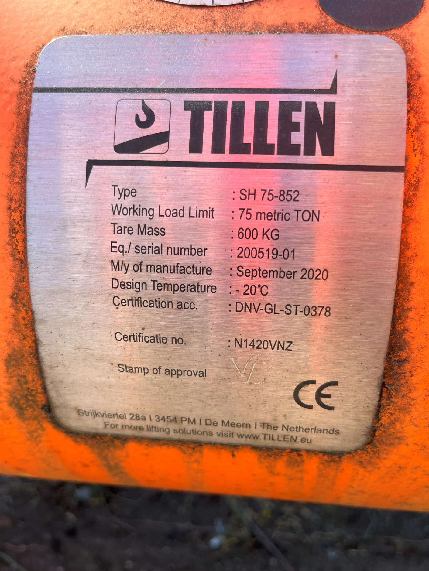 Heavy-duty lifting spreader beams manufactured by Tillen. This beam is designed for high-capacity lifting operations, with a Working Load Limit of 75 metric tons each. Manufactured in September 2020 and certified according to DNV-GL-ST-0378 standards.